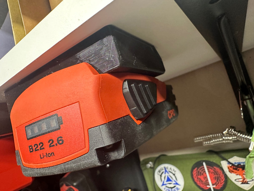 individual locking mounts for Hilti B22 batteries. Each mount securely locks your battery in place — just press the release button to remove, exactly like on your tools.