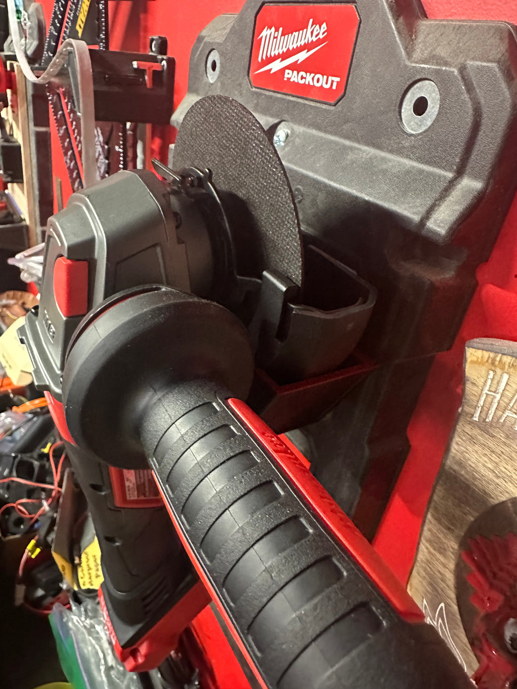 This is the perfect hanger for your Milwaukee 4.5 disc grinder…. has a convenient spot for that easy to lose key…. comes in either Packout wall or flat wall version!