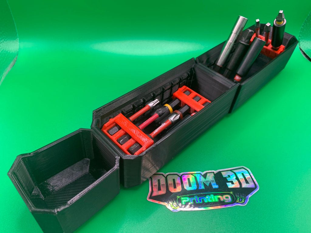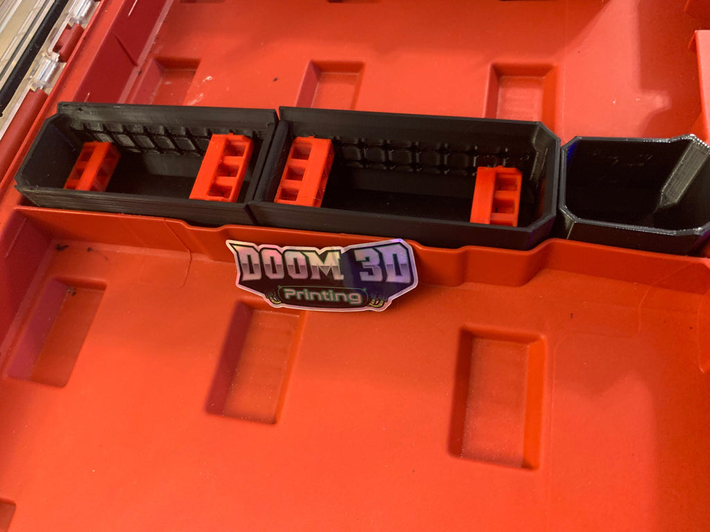 This is my personal design of These 3 shallow snug fit, thick walled bins adapted to hold bits…. Comes with 4 custom bit holders. These bins fit into the centre of your slim clear top Packout box. The bits are for display purposes and are not included.